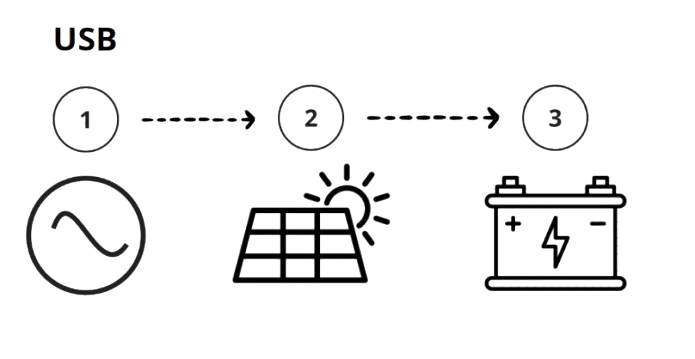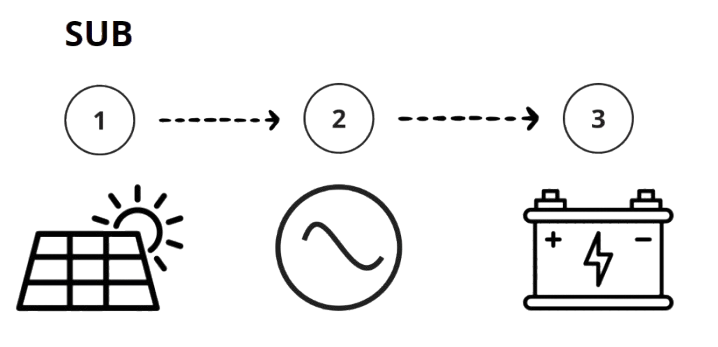 - Cómo funciona: En este modo, la red es la fuente principal para cargar las baterías. La energía solar es secundaria, garantizando que el sistema permanezca confiable, incluso en condiciones climáticas desfavorables.