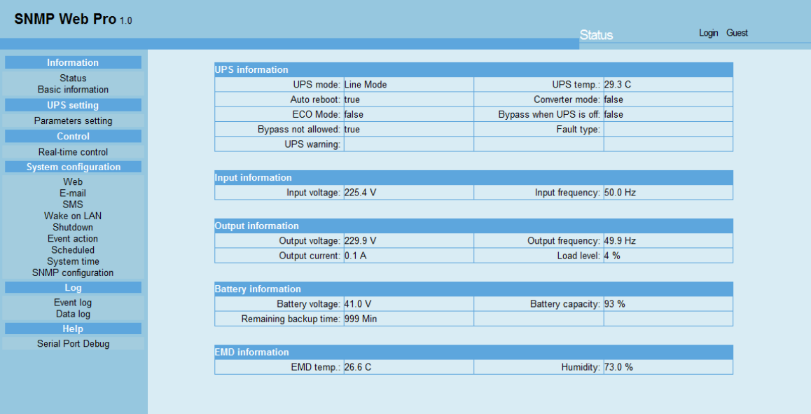 - Gráficos dinámicos de datos de UPS en tiempo real (voltaje, frecuencia, nivel de carga, nivel de batería).