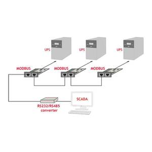 La tarjeta Modbus permite la comunicación entre varios SAI y el sistema host (por ejemplo, SCADA) a través del bus RS-485. Cada SAI está equipado con una tarjeta Modbus dedicada, que proporciona una interfaz de comunicación. Los datos se envían desde los dispositivos a un ordenador a través de un convertidor RS232/RS485 para su posterior procesamiento y análisis en tiempo real.
