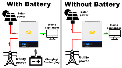 - Con batería: El sistema almacena el exceso de energía solar en la batería conectada, que puede utilizarse posteriormente cuando la energía solar sea insuficiente (por ejemplo, durante la noche o en condiciones de nubosidad). También permite cargar la batería desde la red eléctrica cuando sea necesario, garantizando una alimentación ininterrumpida para sus electrodomésticos.