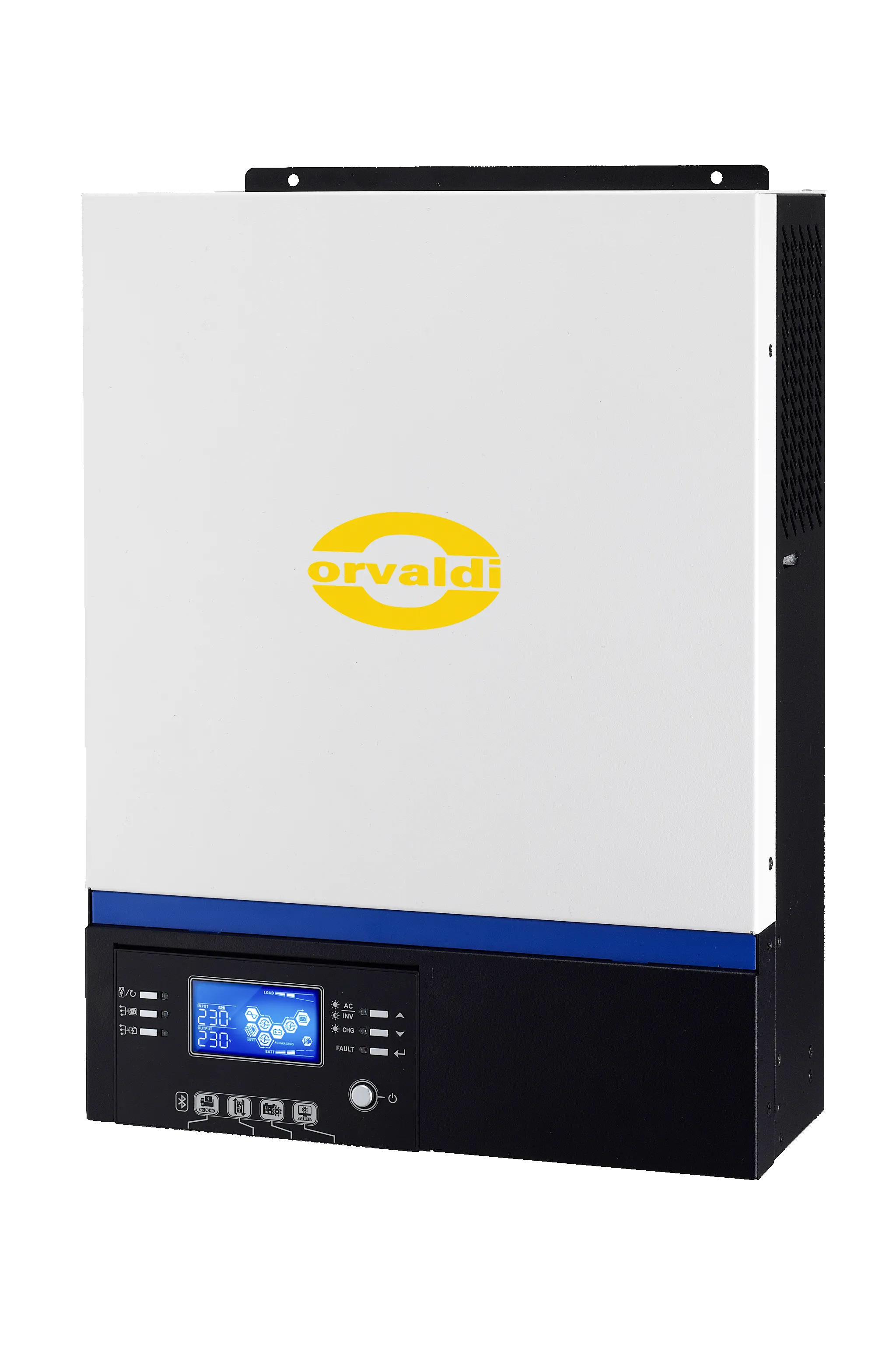 ORVALDI MVIII5K es un dispositivo moderno y multifuncional que combina las funciones de un inversor, un cargador solar y un cargador de baterías para proporcionar energía estable e ininterrumpida en un paquete compacto. Gracias a su avanzada tecnología y alta eficiencia, el inversor es ideal tanto para sistemas domésticos de energía renovable como para instalaciones profesionales. Admite una amplia gama de tensiones de entrada, lo que permite una adaptación flexible a diferentes fuentes de energía, y garantiza una conversión eficiente de la energía de los paneles fotovoltaicos, asegurando un uso óptimo de los recursos disponibles.